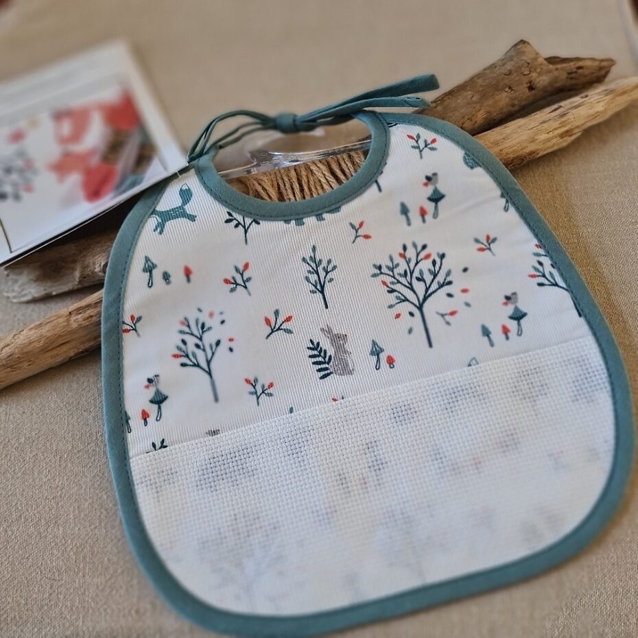 Bavoir à broder, convient aux bébés de 3 mois. Sur celui-ci, vous pouvez broder au point de croix un motif, une date ou encore le prénom de votre choix. Personnalisable, il constitue un cadeau idéal pour une naissance.