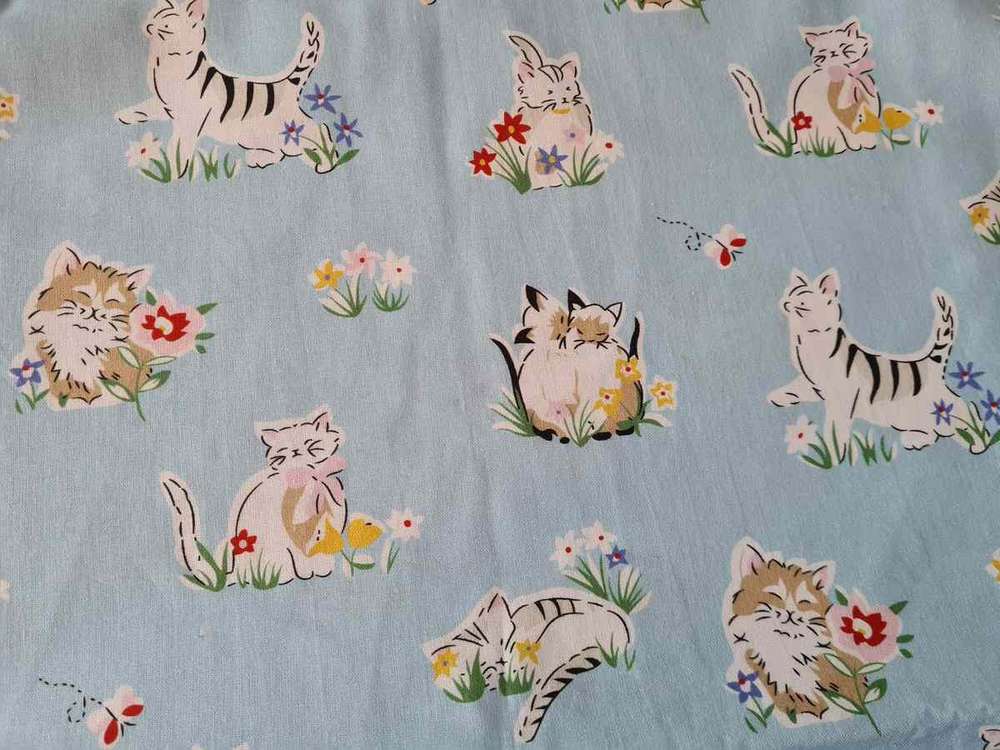LCF- Tissu Vintage , Chat & fleurs bleu ciel