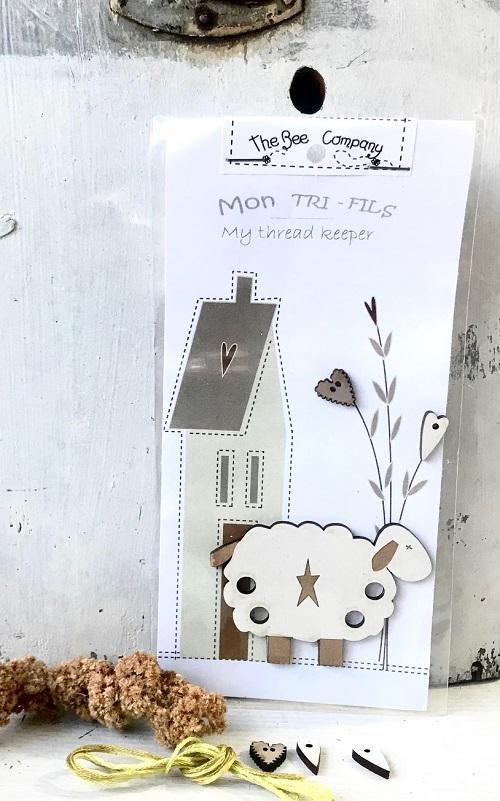 mini tri-fils mouton pour 4 fils – en bois peint – couleur crème et son packaging maisonnette – 2 mini boutons – dimensions du mouton : 7.5×5 cm