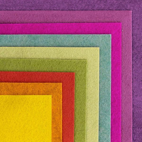 Assortiment de 9 carrés de 15 x 15 cm de feutrines de divers coloris.